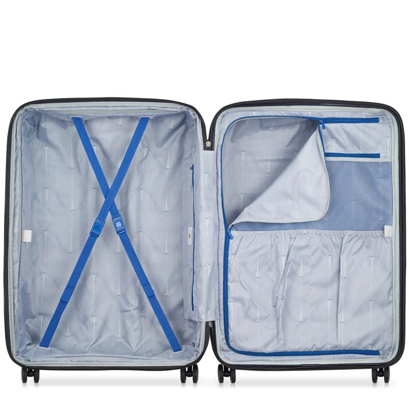Cette valise Delsey Shadow 5.0 propose une capacité initiale d’accueil de 131 litres avec un intérieur entièrement doublé. Après ouverture, a coque se scinde en 2 espaces de volume égal. Le premier espace est équipé de sangles ajustables pour conserver les affaires en place ainsi qu’une petite poche zippée latérale pour isoler de petits accessoires. Quant au second espace, il possède une cloison zippée sur laquelle se profile différentes poches de rangement : zippées, ouvertes, élastiques, en mesh, etc.